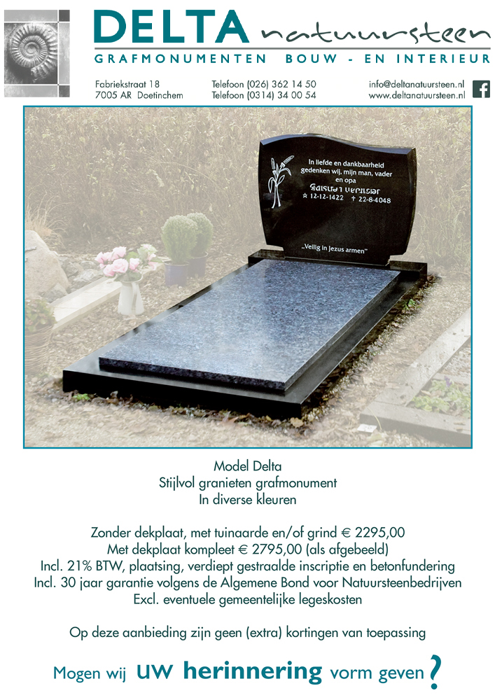Complimenten voor Delta natuursteen. Maandag gebeld, grafsteen verzakt door de vele regen. Na 1 dag weer herstelt toppie Rob van Dis.